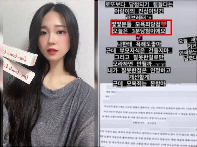 조아람은 지난 3일 "로또보다 당첨되기 힘들다는 아람이의 진심이 담긴 러브레터다"라고 운을 뗀 후 "몇몇 분들 모욕죄 당첨, 오늘은 3분 당첨이다. 나한테 욕해도 좋다. 그런데 부모 자식은 건들지 마라"라며 고소장 일부를 공개했다.