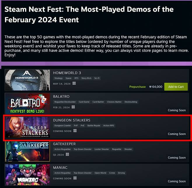 한편 SF(공상과학) RTS(실시간 전략게임) '홈월드3(Homeworld 3)' 등의 쟁쟁한 개발사에서 낸 신작 게임들과 함께 최다 플레이 데모게임 중 하나로 선정된 던전스토커즈는 테스트 기간 중 글로벌 유저들의 피드백을 받아 게임의 완성도를 높여 나간다는 계획이다.