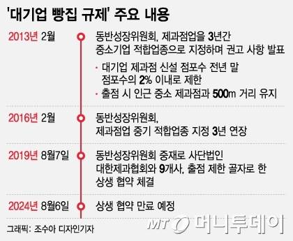 2013년 중소기업적합업종 지정으로 시작된 빵집 출점 규제는 2019년 대기업 제빵업계와 대한제과협회가 맺은 상생협약으로 이어져 10년째 계속되고 있다.