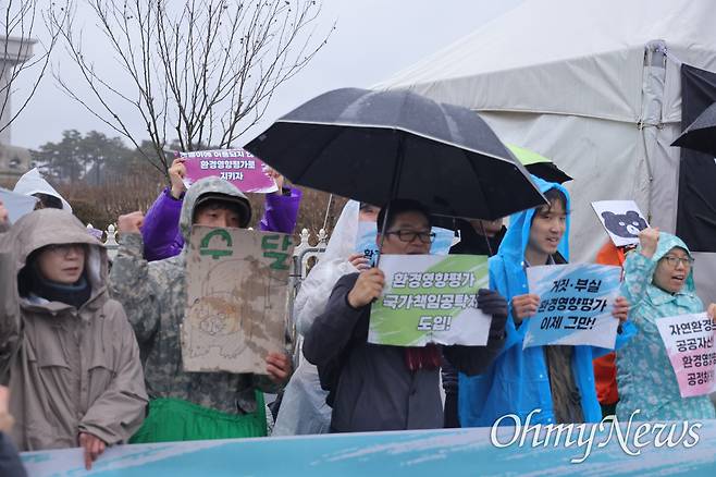 전국연대는 "협의 검토기관인 환경부와 환경청, 국가 전문 검토기관의 독립성 보장도 미흡하기 짝이 없어 정권이 바뀌고, 장관이 바뀌면서 앞에서 내렸던 결론이 정반대로 바뀌는 일도 허다하다"라며 "허울뿐인 환경영향평가법으로는 더 이상 지속가능한 국토조성이 불가능하다"라고 주장했다.