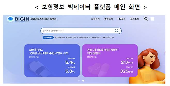 보험은 어렵고 복잡하다는 인식이 큰데 소비자의 정보 접근성과 활용성 개선에 도움을 주기 위해 다양한 서비스를 한 곳에서 쉽게 이용할 수 있도록 관련 플랫폼을 오픈했다. 보험개발원 홈페이지에서 링크를 클릭하거나 네이버에서 보험정보 빅데이터 플랫폼(BIGIN)을 검색하면 이용할 수 있다.