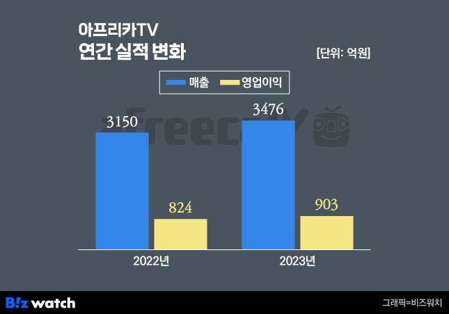 아프리카TV는 지난해 연결기준 매출액 3476억원, 영업이익 903억원을 기록했다고 15일 밝혔다. 연간 기준으로 매출과 영업이익 모두 최대 규모로, 전년과 비교하면 각각 10%씩 증가했다. 당기순이익은 746억원으로 전년대비 25% 늘었다.