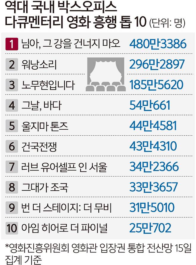 관람객 추이를 고려하면 주말 60만명을 넘어설 전망이다. 60만 관객은 역대 국내 개봉 다큐멘터리 영화 중에는 흥행 4위에 해당한다. 역대 국내 개봉 다큐멘터리 흥행 순위 1위는 2014년에 개봉해 480만3386명이 관람한 ‘님아, 그 강을 건너지 마오’다. 2위 ‘워낭소리’(296만2897명), 3위 ‘노무현입니다’(185만5620명) 순이다.