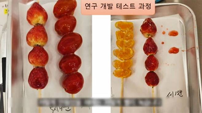 [저희 것은 레시피를 개발해서 그 성분을 넣으면 탕후루를 제조를 해도 녹는 시간이 지연됩니다.]