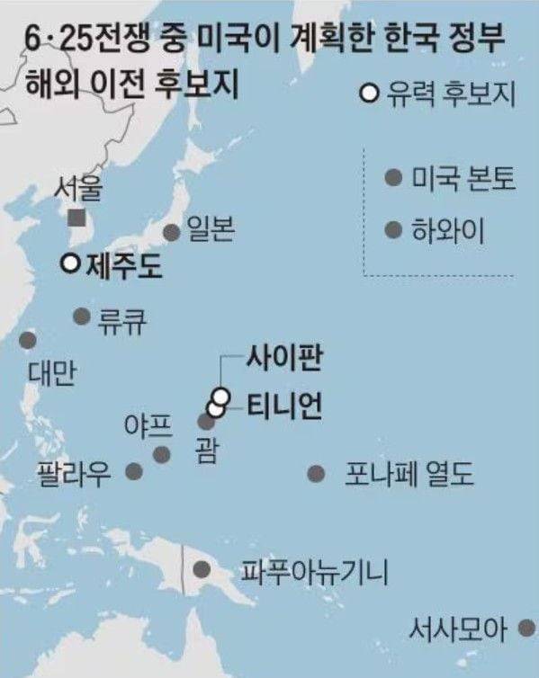 훨씬 더 비극적인 시나리오도 있었습니다. 1951년 4월 3일 미 극동군사령부는 비밀 작전계획 CINCFE4-51은 이런 내용을 담고 있었습니다. “대한민국 정부와 선별된 포로를 사이판과 티니언 섬에 이송한다.” 팔라우와 괌, 파푸아뉴기니, 서사모아 같은 다른 후보지를 고려한 끝에 압축된 두 지역이었습니다. 사이판(115㎢)과 티니언(101㎢)의 면적은 각각 현재 대한민국 면적(10만401㎢)의 0.1% 수준입니다.([유석재의 돌발史전] 1951년, 대한민국은 사이판으로 ‘이전’할 뻔했다 https://www.chosun.com/culture-life/relion-academia/2022/06/03/UIYEVW4YLZAR7DXZNCRHEMF3YM/)