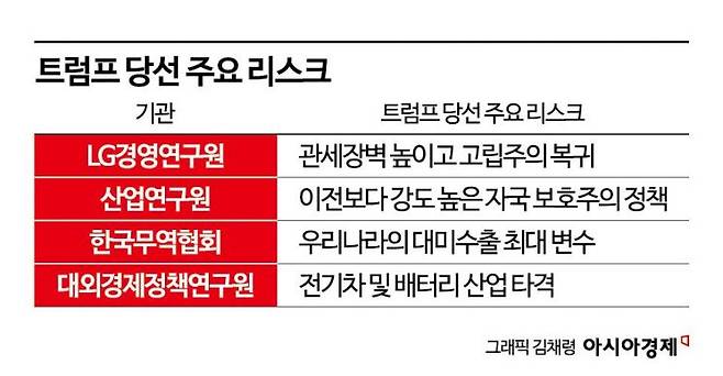 한국무역협회는 트럼프 재집권이 우리나라의 대미수출에 가장 큰 변수가 될 것으로 예측했다. 트럼프가 바이든 대통령이 주도한 인플레이션감축법(IRA) 폐지도 고려하고 있어 IRA 발효 이후 미국에 가장 많이 투자한 한국 기업에 부정적인 영향도 우려했다.