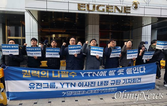 YTN 지부는 16일 대주주인 유진기업 서울 여의도 사옥 앞에서 기자회견을 열고 "유진기업이 단체협약을 어기고 YTN사장 등을 내정했다"면서 "공정방송을 지키기 위한 제도를 무력화했다, 방통위의 조건부 승인 취지를 정면으로 어긴 셈이니 승인 취소 사유가 분명하다"고 주장했다.
