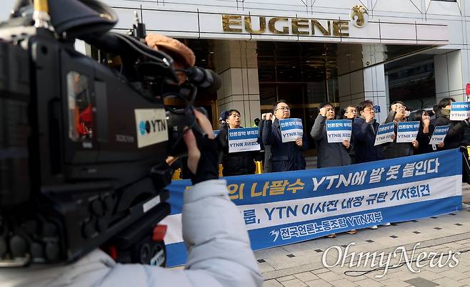 | ▲ 윤창현 전국언론노동조합 위원장과 YTN 지부 조합원들이 16일 오전 서울 여의도 유진기업 사옥 앞에서 기자회견을 열고 김백 전 YTN 상무의 차기 YTN 사장 내정을 규탄하고 있다. |