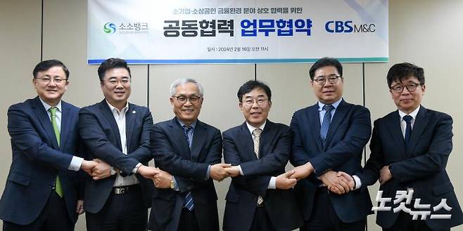 박상용 CBS M&C 대표이사와 박준덕 소소뱅크 설립준비위원회 회장이 16일 서울 목동 CBS M&C 대회의실에서 열린 CBS M&C-소소뱅크 설립준비위원회 소기업.소상공인 금융환경 분야 상호 협력을 위한 공동협력 업무협약식에서 기념 촬영을 하고 있다. 왼쪽부터 심헌섭 소소뱅크 설립준비위 이사, 서대엽 소소뱅크 설립준비위 부회장, 박 회장, 박 대표이사, 이기완 CBS출산돌봄국민운동본부 부본부장, 정승용 CBS M&C 콘텐츠총괄부장.