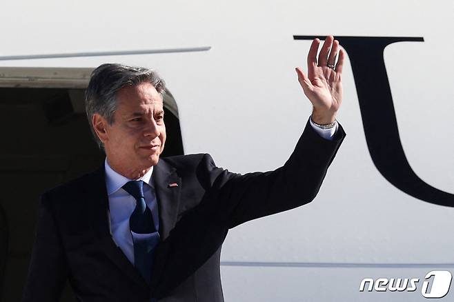 (티라나 AFP=뉴스1) 우동명 기자 = 토니 블링컨 미국 국무장관이 15일(현지시간) 유럽 순방에 나서 알바니아 티라나 국제 공항에 도착해 손을 흔들고 있다. 2024. 2.16