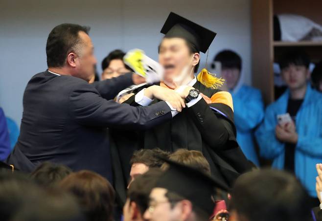 | 16일 오후 대전 유성구 한국과학기술원(KAIST)에서 열린 2024년 학위수여식에서 한 졸업생이 윤석열 대통령에게 항의하자 경호원에게 제지당하고 있다. 2024.2.16. 대전충남공동취재단 |