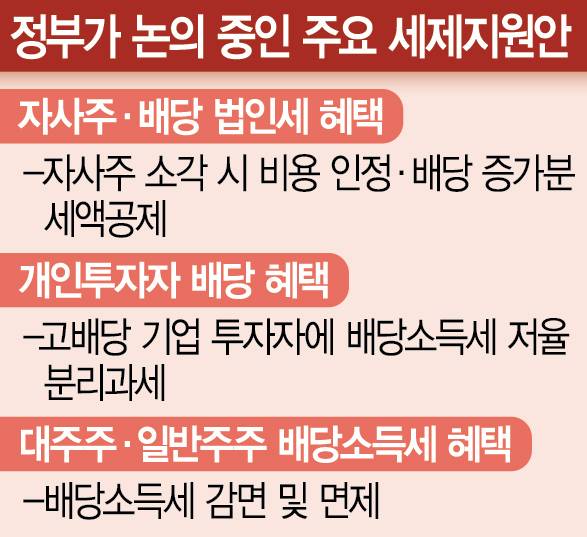 정부 안팎에서는 이번 대책의 뼈대를 세제 혜택으로 보고 있다. 이와 관련해 기업이 자사주 소각 시 이를 비용으로 처리해 법인세를 줄여주는 방안이 거론되고 있다. 전액 인정보다는 일부분을 인정해주는 방안이 유력하다. 기업들의 전기 대비 배당 증가분에 대한 세액공제안도 같은 맥락에서 검토되고 있다. 고배당 기업 투자자에 대한 배당소득세를 저율 분리과세하는 방식 역시 언급된다. 금융계의 한 관계자는 “법인세 이외에 (당국이) 건드릴 부분은 많지 않아 보인다”고 전했다.