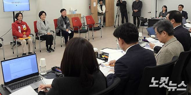 국민의힘 공관위가 13일 오전 서울 여의도 중앙당사에서 4·10 총선 후보 공천을 위한 면접을 실시하고 있다. 국민의힘은 22대 총선에서 서울 19곳, 광주 5곳, 제주 1곳에 대한 단수 공천을 의결했다. 왼쪽부터 이영 전 중소벤처기업부 장관, 이혜훈 전 의원, 하태경 의원. 윤창원 기자