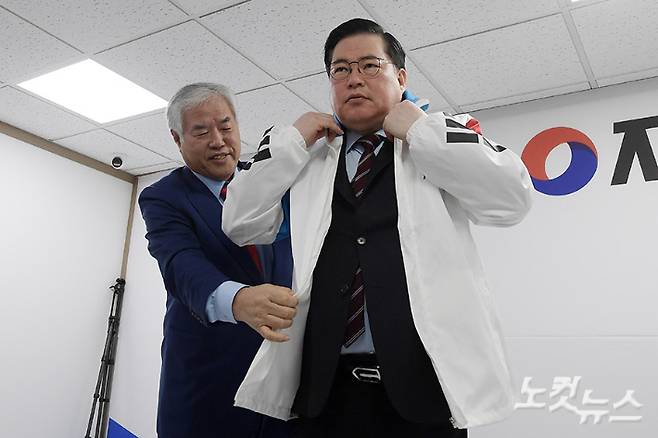 유동규 전 성남도시개발공사 기획본부장이 14일 서울 여의도 자유통일당 당사에서 입당 및 제22대 총선 인천 계양을 출마 기자회견에서 전광훈 목사로 부터 당복을 전달받고 있다. 유 전 본부장은 "하늘 아래 분당이라는 그 분당에서 원주민들의 땅을 헐값에 수용해서 비싸게 팔아먹기 위해 행정권을 남용한 정치인이 있다"며 "껍데기 밖에 안 남은 이재명이 더 이상 여러분이 주신 표로 방탄조끼를 만들어 입는 꼴은 못 보겠어 나왔다"고 총선 출마 배경을 밝혔다. 윤창원 기자