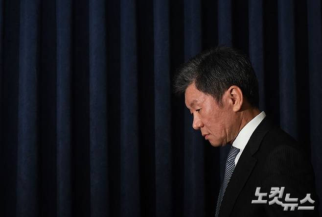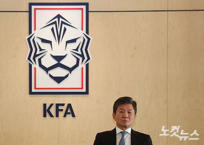 정몽규 대한축구협회장이 16일 오후 서울 종로구 축구회관에서 브리핑을 갖고 클린스만 감독의 경질을 발표하기 위해 들어서고 있다. 대한축구협회는 이날 위르겐 클린스만 축구대표팀 감독에게 경질을 통보했다. 지난해 2월 27일 클린스만 감독을 선임하겠다고 발표한 지 1년이 채 지나지 않아서다. 황진환 기자