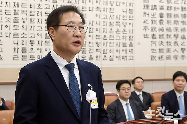 박성재 법무부 장관 후보자가 15일 서울 여의도 국회에서 열린 인사청문회에서 모두발언을 하고 있다. 박 후보자는 검찰총장과의 관계 설정에 대해 "검찰총장은 검찰총장으로서 법과 원칙에 따라서 자기 업무를 수행하고 저는 장관으로서 본연의 업무를 수행하면 그것으로 각자 최선의 자리를 지키는 것"이라고 밝혔다. 윤창원 기자