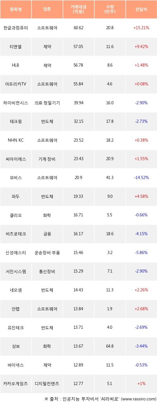 외국인 투자자의 순매수 상위 20개 종목은 한글과컴퓨터, 티앤엘, HLB, 아프리카TV, 하이비젼시스템, 테크윙, NHN KCP, 씨아이에스, 모비스, 파두등이다.