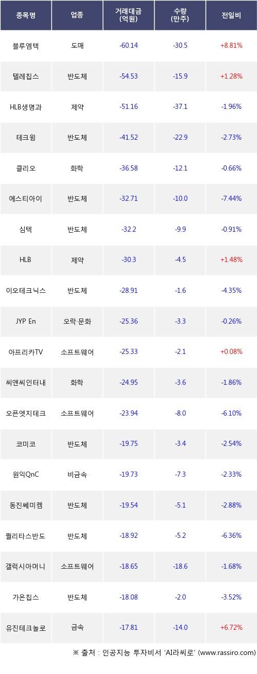기관 투자자의 순매도 상위 20개 종목은 블루엠텍, 텔레칩스, HLB생명과학, 테크윙, 클리오, 에스티아이, 심텍, HLB, 이오테크닉스, JYP Ent.등이다.