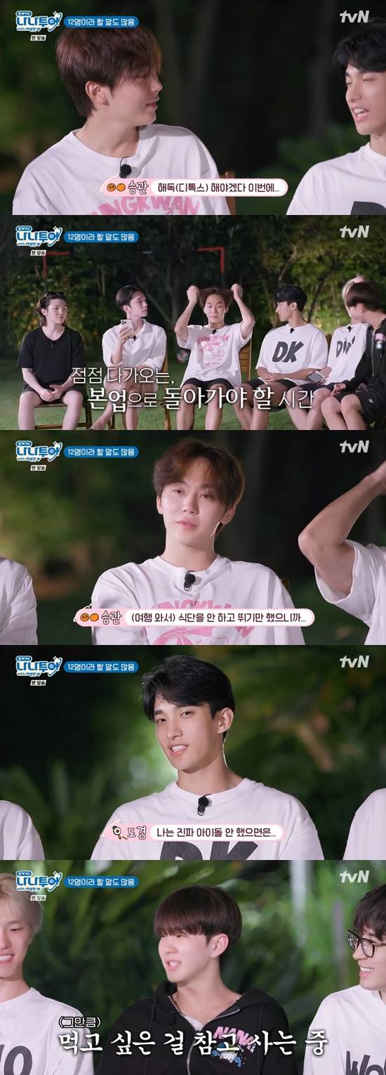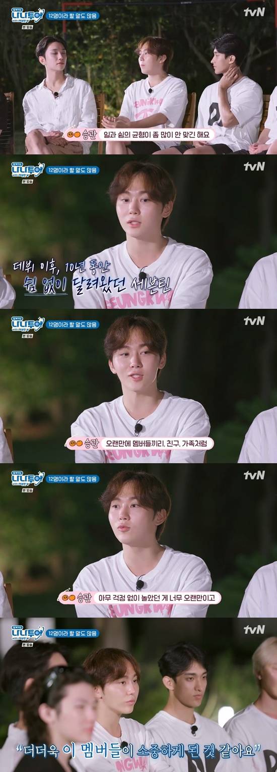 승관은 "세븐틴으로 활동하면서 일과 쉼의 균형이 많이 안 맞는다. 90% 이상 일로만 지낸다. 오랜만에 멤버들끼리 아무 걱정 없이 놀았다. 이런 감정 처음이다. 더더욱 이 멤버들이 소중하게 된 것 같다"고 말했다.