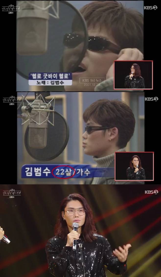 김범수는 "얼굴없는 가수란 타이틀을 박았는데, 취재하고 싶다니 저렇게 조율한 거다"라며 옆모습 인터뷰 탄생 비화를 전했다. 김범수는 "정말로 90도 방향으로 했다. 저 기록 자체가 지금까지도 제게 남아있기 때문에 (좋다)"고 덧붙였다.