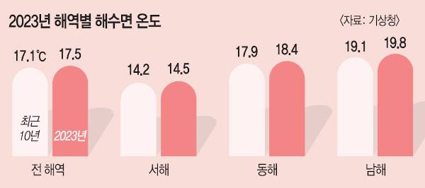 바다의 상황도 마찬가지다. 지난해 우리나라 해역 해수면 온도는 연평균 17.5도로 최근 10년 사이 두 번째로 높았다. 국립수산과학원이 인공위성을 이용해 조사한 한반도 해역 표층 수온 통계에선 이보다 높은 연평균 19.8도를 기록했다. 1990년 관련 조사를 시작한 이래 최고치이자 최근 20년 평균 표층 수온보다 0.6도나 높은 수치다.