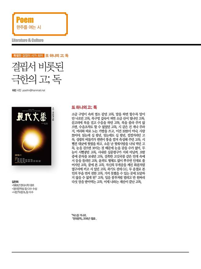 시인들에게 고독은 존재성을 극대화하는 실감적 정황이거나 참된 본질을 향한 직관적 질료로 쓰인다. 김언희 시인의 「또 하나의 고; 독」은 그러한 시인들의 특징을 확연히 대변해주고 있는 작품이다. 도입부부터 수많은 고독의 정황들이 감각적인 언술에 의해 나열돼 있다. 이것은 단순한 병치가 아니다. 알게 모르게 하나의 귀결점을 향해 움직이는 이미지들의 점진적 '이어달리기'이다.