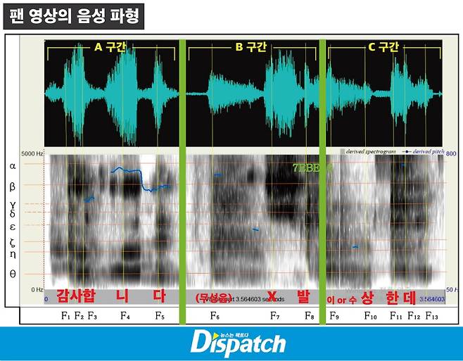 성문 분석 결과, A 구간은 '감사합니다', B 구간은 '무성음+X발', C 구간은 '이 or 수+상한데'로 판별됐다.