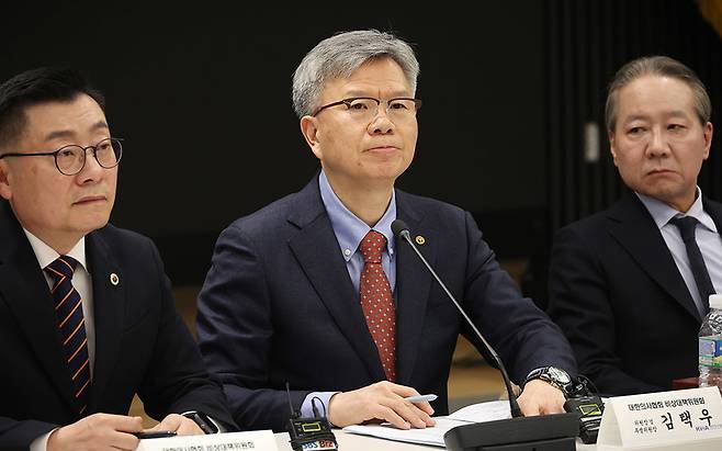 [17일 서울 대한의사협회 대강당에서 김택우 위원장이 의료정원 증원 저지를 위한 비상대책위원회 제1차 회의를 주재하고 있다. (사진=연합뉴스)]