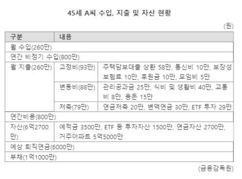45세 A씨의 월 수입은 260만원이다. 이와 별도도 연간 비정기수입이 800만원 들어온다. 월 지출도 역시 260만원이다. 고정비가 93만원으로 주택담보대출 상환금(58만원), 통신비(10만원), 보장성보험료(10만원), 후원금(10만원), 모임비(5만원) 등 합산액이다. 변동비는 관리·공과금(25만원), 식비·생활비(40만원), 교통비(8만원), 용돈(15만원) 등을 합쳐 88만원이다. 저축은 연금저축(20만원), 변액연금(30만원), 상장지수펀드(ETF·29만원) 등 79만원씩 하고 있다. 연간비용은 800만원이다.