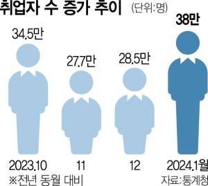 통계청 발표에 따르면 지난달 15세 이상 취업자는 2774만 3000명으로 작년 같은 달보다 38만 명 증가했습니다. 취업자 수 증가 폭은 작년 10월 34만 6000명에서 11월(27만 7000명)·12월(28만 5000명) 줄었다가 석 달 만에 30만 명대로 회복한 수치입니다. 1월 취업자 수 증가 폭은 작년 3월(46만 9000명) 이후 10개월 만에 최대였습니다.