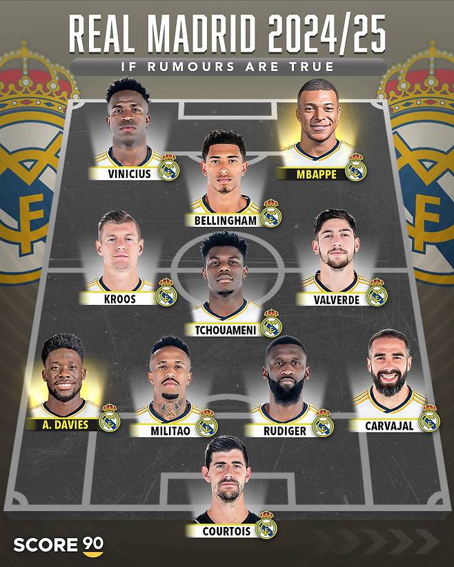 '루머대로면' 레알은 더욱 강해진다. '스코어90'은 카를로 안첼로티 감독이 이끄는 레알이 2024~2025시즌 4-4-2 포메이션에서 음바페와 비니시우스 주니오르가 투톱을 꾸릴 것으로 전망했다.