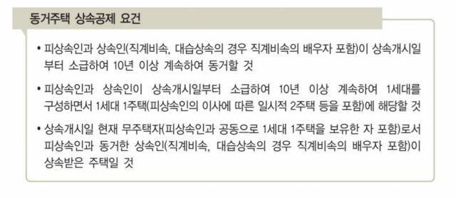 동거주택 상속공제는 절세 효과가 매우 크지만 요건이 매우 까다로워 정확한 내용을 알아둬야 낭패를 보지 않습니다. 동거주택 상속공제는 다음 세 가지 요건(상속증여세법 23조 2항)을 모두 충족해야 적용됩니다. ①상속개시일(사망일)로부터 10년 이상 부모와 자녀가 계속 함께 살아야 하고 ②10년 이상 1세대 1주택이어야 하며 ③부모와 동거한 무주택 자녀가 해당 주택을 상속받아야 합니다.