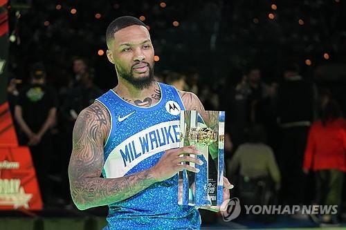 Milwaukee Bucks' Damian Lillard holds the trophy after winning the 3-point contest at the NBA basketball All-Star weekend, Saturday, Feb. 17, 2024, in Indianapolis. (AP Photo/Darron Cummings)