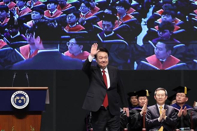 | ▲ KAIST 학위수여식 참석자 향해 인사하는 윤석열 대통령 윤석열 대통령이 16일 대전 유성구 한국과학기술원(KAIST)에서 열린 2024년 학위수여식에 참석해 졸업생, 학부모 등 행사 참석자들을 향해 인사하고 있다. 2024.2.16 [대통령실통신사진기자단] |