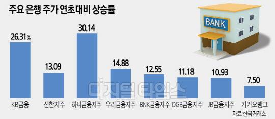 이 외에도 신한지주(13.09%), 하나금융지주(30.14%), 우리금융지주(14.88%) 등 4대 은행지주 주가가 모두 큰 폭으로 올랐다. BNK금융지주(12.55%), DGB금융지주(11.18%), JB금융지주(10.93%), 카카오뱅크(7.50%) 등 지방은행과 인터넷 은행 역시 같은 기간 코스피 수익률(-0.25%)을 훌쩍 웃돌았다. 이 기간 KRX 은행지수는 16.50% 상승했다.