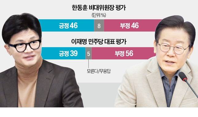한국경제신문이 여론조사업체 입소스에 의뢰해 지난 14~15일 조사, 18일 발표한 여론조사 결과에 따르면 서울과 수도권에서 한 위원장의 직무수행과 관련해 ‘매우 잘하고 있다’ ‘잘하고 있는 편’이라는 평가가 46%였다. ‘잘못하고 있는 편’ ‘매우 잘못하고 있다’ 등 부정 평가도 46%로 동일했다. 이 대표는 긍정평가는 39%에 그쳤고 부정 평가가 56%로 높았다.