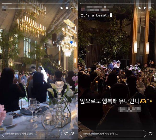 유나의 결혼식에는 AOA 멤버로 함께 활동한 혜정, 찬미 등이 함께 했다. 혜정은 결혼식에 참석해 신랑과 함께 걷고 있는 유나의 모습을 공개했다. 혜정은 “울 언니 잘가”라며 파란 하트로 마음을 전했다. 찬미도 “앞으로도 행복해 유나 언니”라며 혜정의 인생 2막을 응원했다.