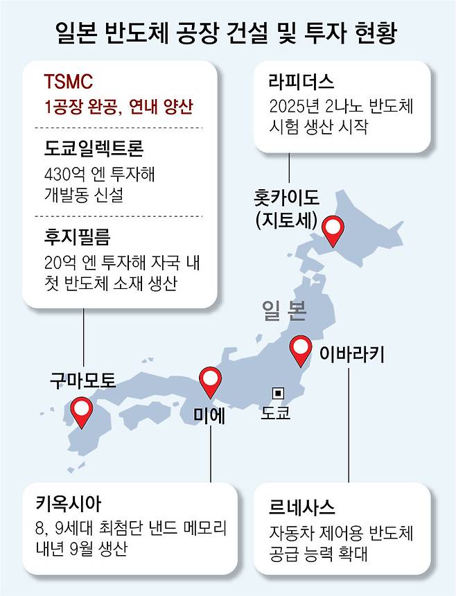 TSMC 투자는 24일 준공으로 끝나는 단일 프로젝트가 아니다. 올해 말 12∼28나노급 양산과 동시에 6나노급 2공장을 착공해 2027년 2공장 양산이 개시된다. 3공장 건설도 검토 중이다. 차량뿐 아니라 슈퍼컴퓨터 등으로 분야를 확대하겠다는 것이다. 이미 세계적 수준인 반도체 소재, 장비 생산력에 TSMC 공장 등이 더해지면 일본은 단숨에 세계 정상급 반도체 산업 인프라를 갖추게 된다.