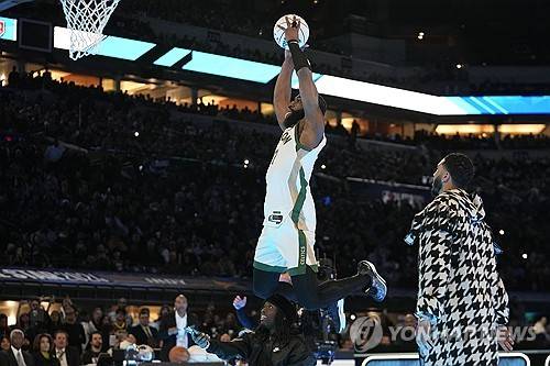 Boston Celtics' Jaylen Brown dunks during the slam dunk competition at the NBA basketball All-Star weekend, Saturday, Feb. 17, 2024, in Indianapolis. (AP Photo/Darron Cummings)