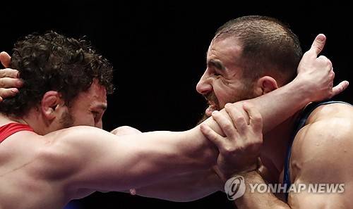 epa11164215 Gold medalist Feyzullah Akturk of Turkey (blue) in action against silver medalist Boris Makoev of Slovakia (red) in the Free Style wrestling 92Kg category final of the European Wrestling Championships held in Bucharest, Romania, 18 February 2024. EPA/Robert Ghement