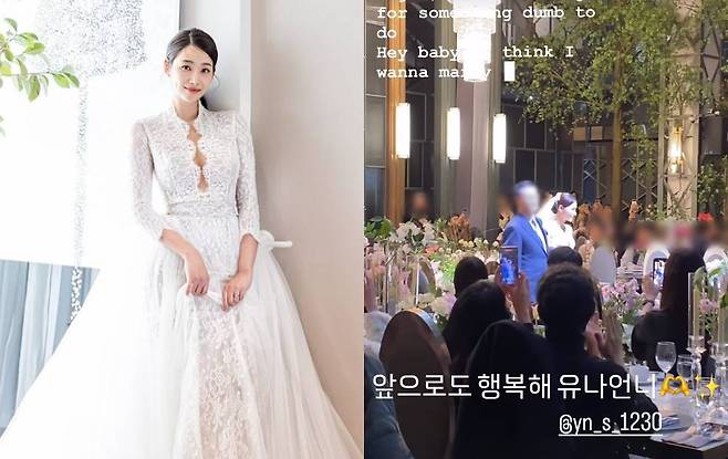 AOA 멤버 혜정과 찬미는 자신의 채널에 각각 "울 언니 잘가ㅠㅠ", "앞으로도 행복해 유나언니"라며 결혼식 영상을 게재해 팬들의 반가움을 자아냈다.