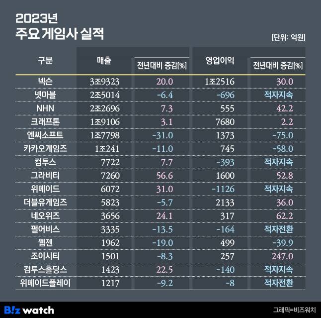 비즈워치가 16개 주요 게임사 넥슨·넷마블·NHN·크래프톤·엔씨소프트·카카오게임즈·컴투스·그라비티·위메이드·더블유게임즈·네오위즈·펄어비스·웹젠·조이시티·컴투스홀딩스·위메이드플레이의 지난해 실적을 집계한 결과 절반에 해당하는 8곳(넥슨·NHN·크래프톤·컴투스·그라비티·위메이드·네오위즈·컴투스홀딩스)은 매출이 전년대비 성장했으나 나머지 8곳은 감소했다.
