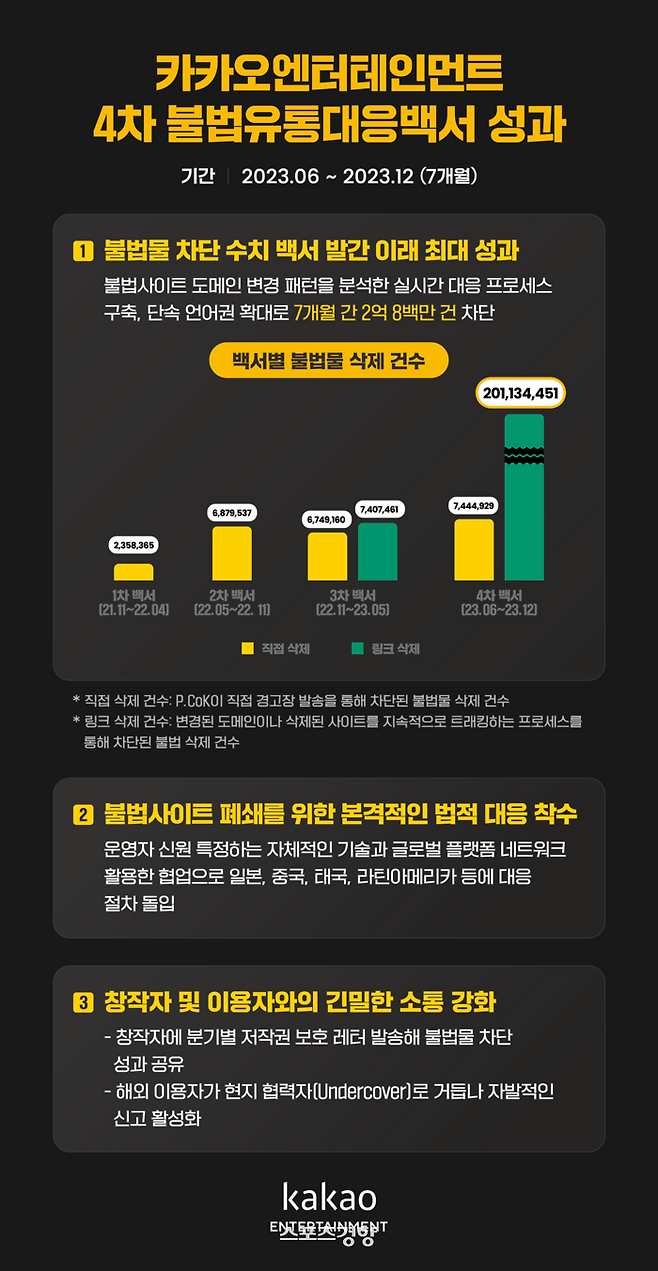 카카오엔터는 19일 지난 7개월간 불법 유통 대응 성과를 집약한 ‘4차 불법유통대응백서’를 발산했다고 밝혔다.