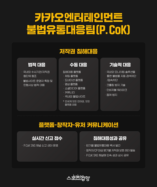 카카오엔터 불법유통 대응팀 이호준 법무실장은 “창작자들의 권익을 보호하고 건강한 생태계를 조성하기 위해 업계 최초로 결성한 카카오엔터 불법 유통대응팀은 이제 단연 국내 콘텐츠 업계 최고 수준의 웹툰, 웹소설 전방위적인 불법 유통 대응 성과를 보여주고 있다”며 “올해는 운영자 검거를 목표로 국내외 수사기관과의 협업 및 불법사이트 운영자 특정 프로세스 정립을 위해 저각권 보호 책임 의무를 다할 것”이라고 했다.