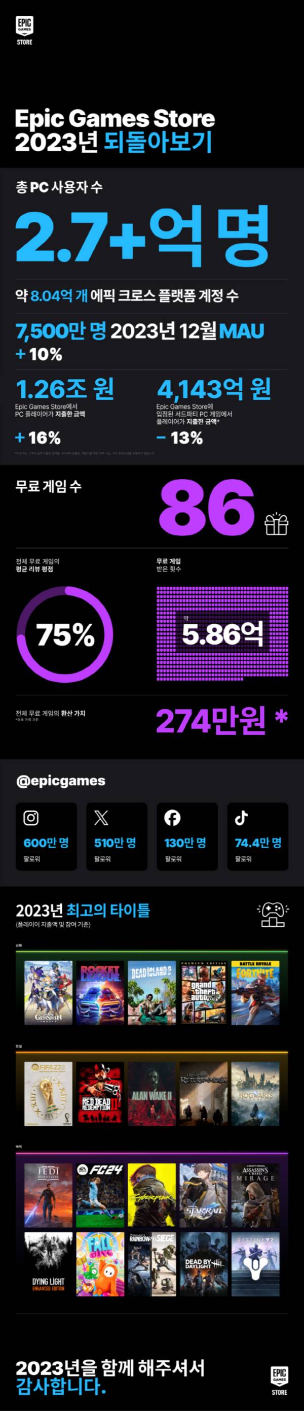 인포그래픽에 따르면 에픽게임즈스토어의 전체 PC 사용자는 2억 7000만 명 이상으로, 2022년 2억 3000만 명에서 17.4%에 달하는 4000만 명이 증가했다. 에픽게임즈의 크로스 플랫폼 계정 수는 총 8억 400만 개에 달했으며, 일간 활성 사용자 수(Daily Active Users, DAU)는 최대 3610만 명을 기록했고, 월간 활성 사용자 수(Monthly Active Users, MAU)는 최대 7500만 명을 기록하며 2022년 6800만 명 대비 10.3% 증가한 것으로 집계됐다.