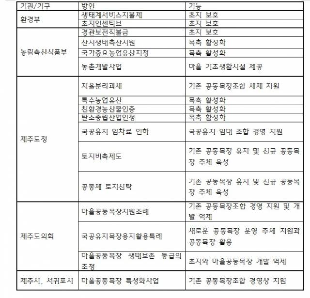 그리하여 제주도 마을공동목장의 보존과 활용을 위해 다양한 공적 지원의 방책들이 제시되고 있다. 그 아이디어들을 담당 기관 내지 기구별로 망라하여 기능을 정리하면 다음과 같다.