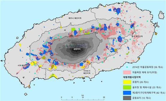 위 그림은 토지+자유연구소 김성훈이 작성한 것("제주도 공동목장 해체 실태 보고서." <제주연구> 8호, 2016)으로서 2014년 시점 공동목장 해체지역과 대형개발사업지역 중첩 상태를 보여준다. 제주도의 대형개발사업이 중산간 지대에 집중되어 있음을 알 수 있다. 대형개발사업의 규모는 일부 예외를 제외하면 해안 지대보다 중산간 지대의 대형개발사업이 월등히 크다. 사업 유형은 골프장, 유원지, 관광단지, 리조트와 같은 관광산업 진흥을 위한 관광·레저 용도가 다수를 차지한다.