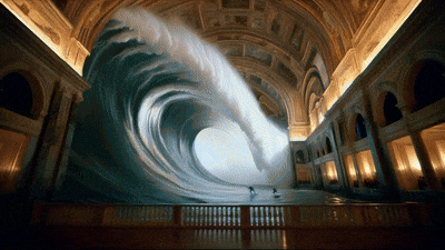 프롬프트 : “화려한 장식으로 유명한 문화유산 공간 속에서 거대한 파도가 높이 솟아올랐다가 부서지기 시작합니다. 순간을 포착한 두 명의 서퍼가 능숙하게 파도를 헤쳐나갑니다.” 오픈AI 제공