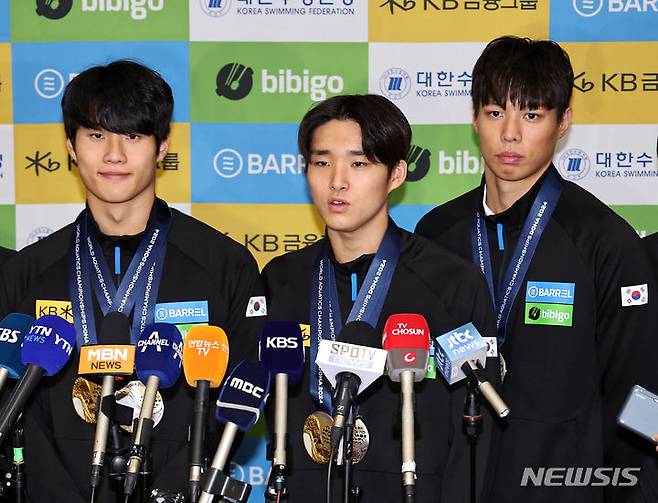[인천공항=뉴시스] 김금보 기자 = 카타르 도하 세계수영선수권대회 경영 국가대표 김우민이 19일 오후 인천국제공항 제1여객터미널을 통해 귀국한 뒤 인터뷰하고 있다. 2024.02.19. kgb@newsis.com