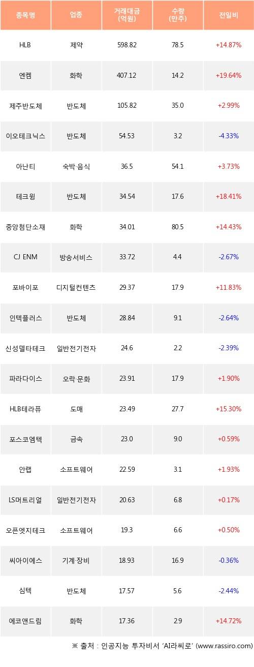 외국인 투자자의 순매수 상위 20개 종목은 HLB, 엔켐, 제주반도체, 이오테크닉스, 아난티, 테크윙, 중앙첨단소재, CJ ENM, 포바이포, 인텍플러스등이다.